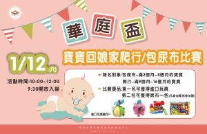 華庭要舉辦 寶寶回娘家爬行/ 包尿布比賽囉! 歡迎出中心的媽媽帶寶貝回華庭參加拿好獎!...