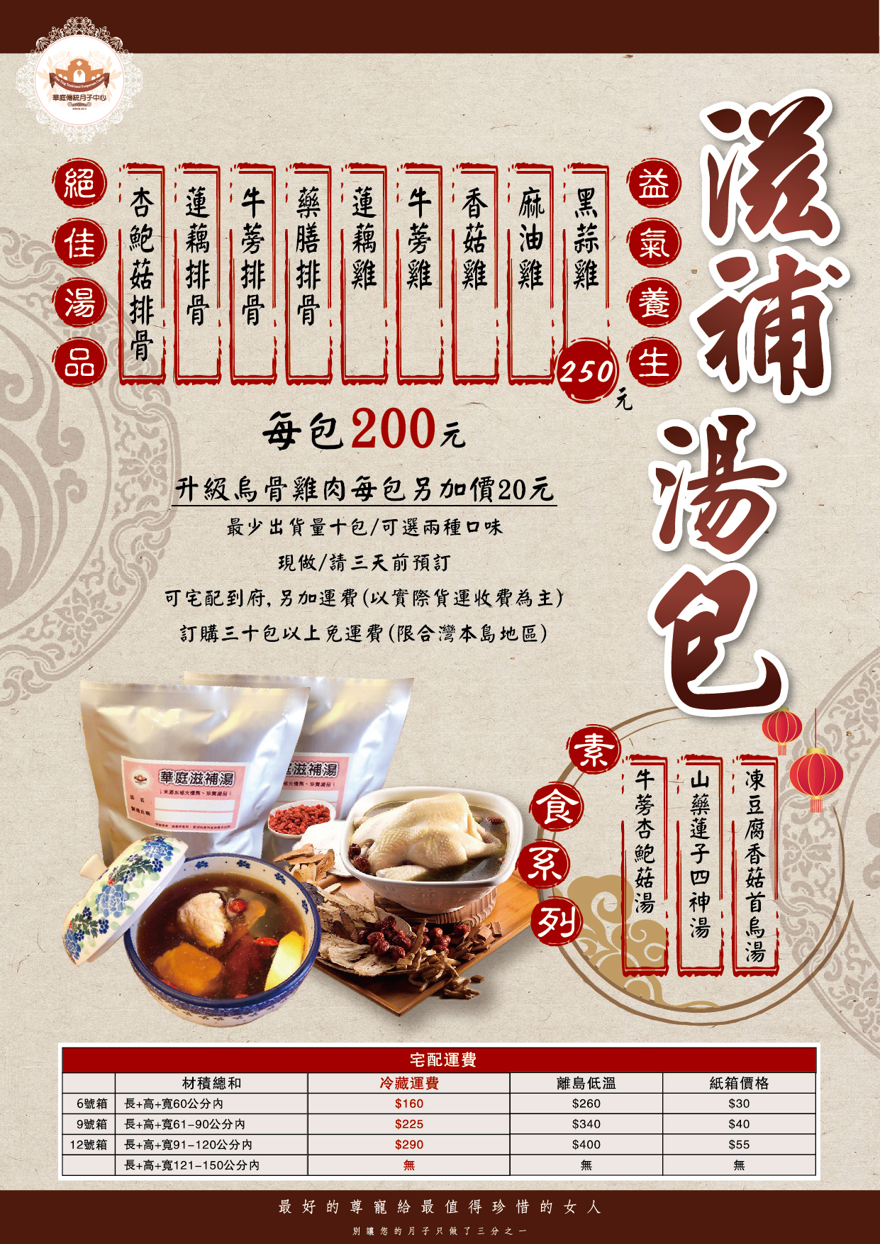 月子餐是坐月子的主軸,也是月子中心為媽媽調理身體的關鍵之一,出住的月子媽媽面臨回歸職場,照護小BABY,但因為環境、外在誘惑等,不一定能再享有月子中心完備、嚴謹的營養補給,於是,華庭費心推出滋補湯系列給最需要的您在家一樣能獲得營養的照顧!